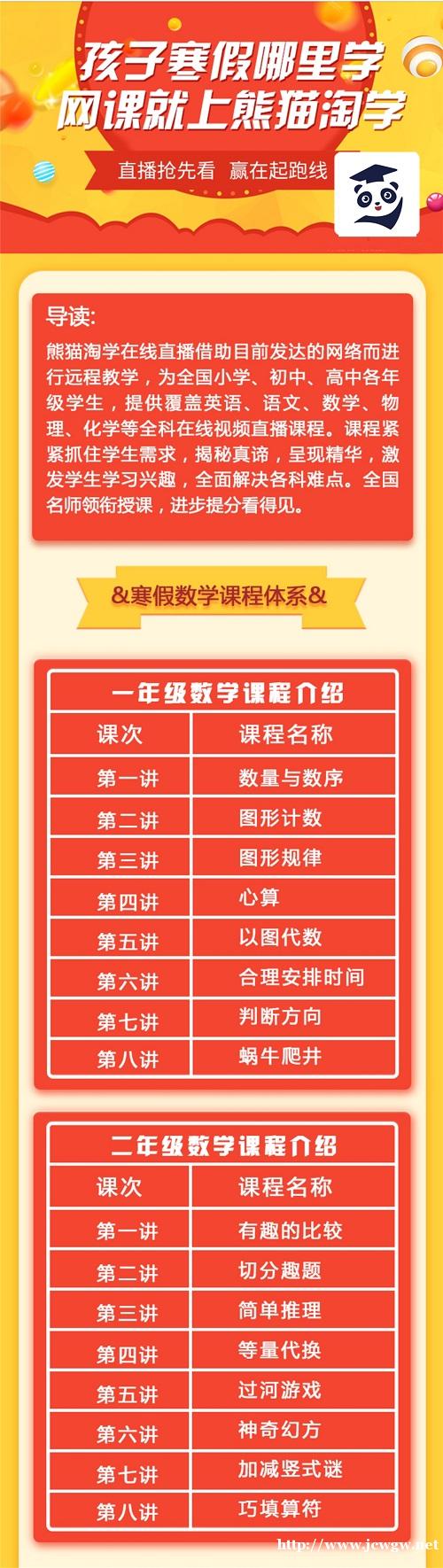 除了数学,熊猫淘学针对寒假还会上线语文、化学、英语和物理等科目直播课,App上现在还有小初高各年级各科目的录播课程。课程内容后续也会更加丰富的~快来报名吧~